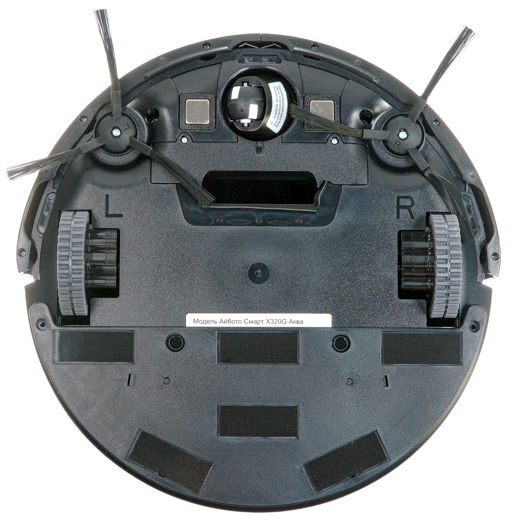 На нижней панели бросается в глаза отсутствие уже привычной моторной щетки: Smart X320G Aqua подметает только боковыми вращающимися «усами». Мусор он всасывает через центральное отверстие, открывающееся непосредственно в контейнер.