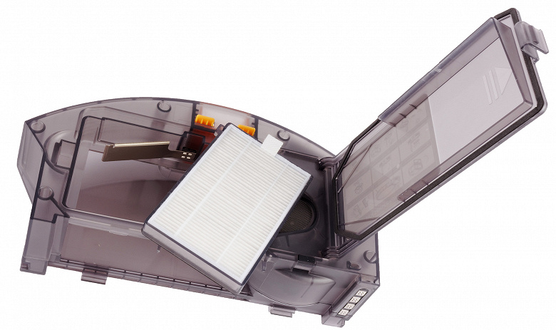 Модуль для основной уборки надо освобождать от мусора, а споласкивать только в том случае, если сильно загрязнился. Промывать под краном предполагается и фильтр предварительной очистки, а HEPA-фильтр очищать приложенной щеточкой.