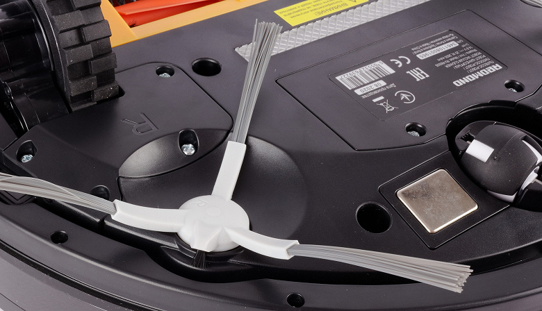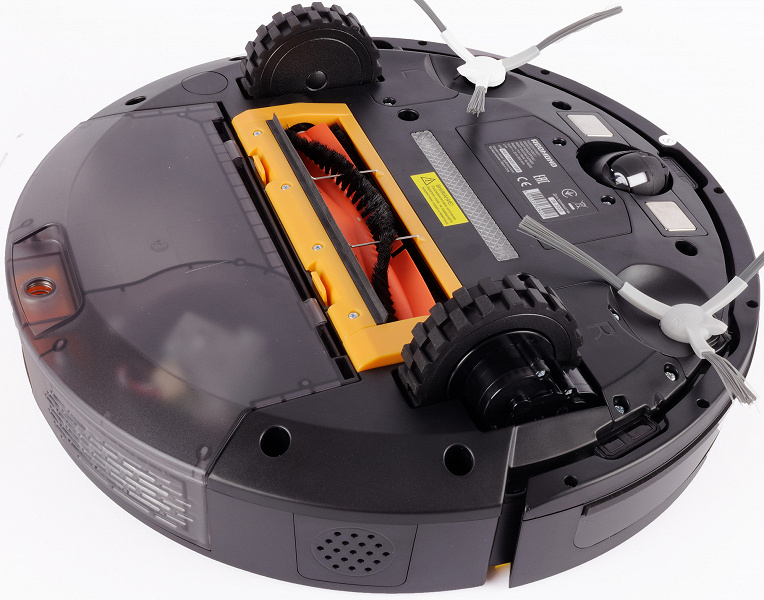 Справа и слева от поворотного колеса размещаются контактные площадки, которые обеспечивают питание устройства при нахождении на базе. Перед колесом — окошки переднего датчика отрыва, защищающие устройство от падения с высоты (к примеру, с лестницы внутри дома). Такие же датчики есть и с боков нижней панели пылесоса.