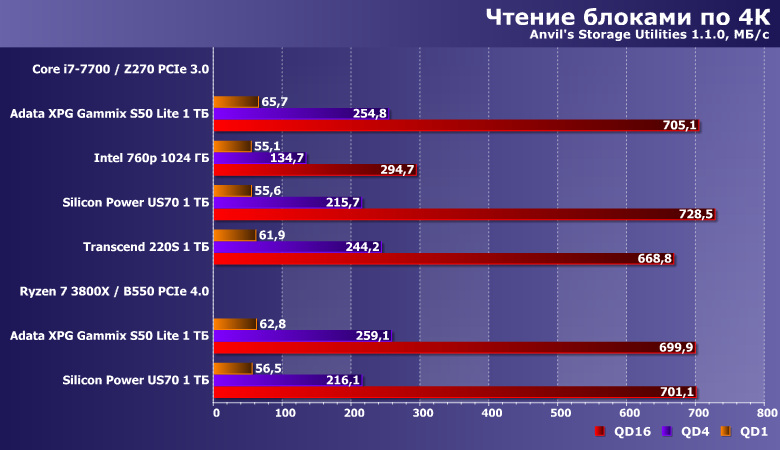 На средних очередях ситуация аналогичная — просто разница между испытуемыми меньше. При этом специфика операций такова, что пропускная способность интерфейса здесь роли не играет — на деле «хватало» бы и пары линий PCIe 3.0. Очередной намек на то, что скорости, вообще-то, бывают разными — очень сильно зависят от того, что именно делается. А производители, что естественно, из всего набора всегда выбирают самые «красивые» значения. Не важно — насколько таковые применимы к практике. Для нее, вон, важно «случайное» чтение 4К без очереди —, но как раз эту цифру (хоть в мегабайтах, хоть в «йопсах») вы почти никогда в ТТХ не увидите: слишком уж маленькая 🙂 Разве что Intel при продвижении Optane не забывает упомянуть выдающиеся результаты в этой дисциплине — так они там и правда выдающиеся.