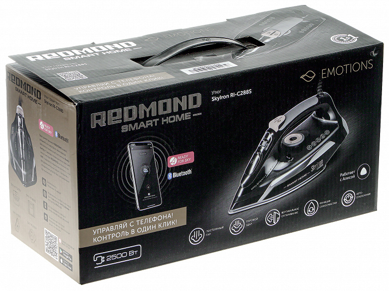 Упаковка серии Emotions отличается от привычного стиля Redmond: она более сдержанная в цветовой гамме и фокусируется на изображении прибора и смартфона для дистанционного управления. На черном фоне мы видим черные же утюг и условный смартфон, переливающийся фольгированный логотип и бронзовые акценты. Они включают в себя название серии Emotions, плашку «Управляй с телефона! Контроль в один клик!» и пиктограммы с подписями ключевых особенностей: постоянный пар, паровой удар, вертикальное отпаривание, функция самоочистки и автоотключение. Также упомянуты мощность 2500 Вт и совместимость с Алисой. Верхняя часть коробки предлагает вид утюга сверху и сообщает о дополнительной гарантии, а также содержит QR код с подробной информацией о товаре. По бокам размещена информация о технических характеристиках товара и о возможностях управления через Ready for Sky, на дне — о производителе.