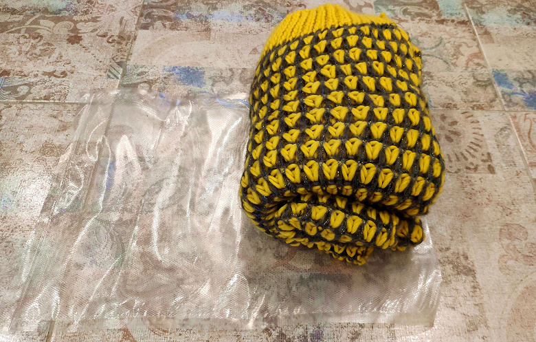 Для проверки применимости прибора в компактном хранении мы взяли сугубо сезонную вещь — пышный шафр из акрила с воздушным плетением, который занимал много места на полке даже под весом других вещей. Он отлично вошел в пакет стандартного размера, и мы запустили автоматический режим.