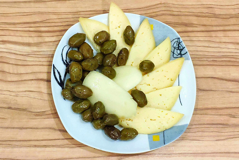 Когда мы прочитали в инструкции о том, что еду можно вакуумировать прямо в тарелке, то живо представили такую ситуацию: 1 января на столе обнаруживается нетронутая тарелка с закусками, а гости ожидаются только 2 января, и тот же сыр заветрится. Мы разложили обычный мягкий сыр и несколько кусочков сорта моцарелла вместе с оливками на средней тарелке, которая прекрасно поместилась в пакет.