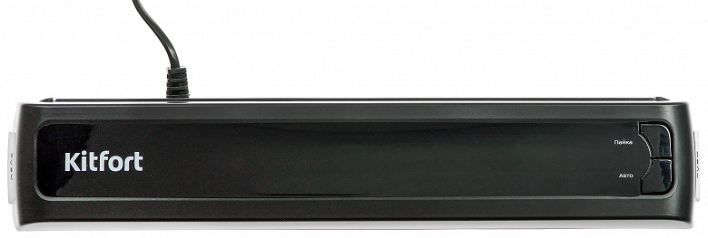 Дизайн упаковки Kitfort остается верным черному фону, белому шрифту, фиолетовым акцентам и схематичному изображению прибора. Мы долго ждали его слоган, но остались разочарованы — производитель ограничился скучным «Продлеваю сроки годности». По сторонам коробки расположены технические характеристики прибора и информация о производителе.