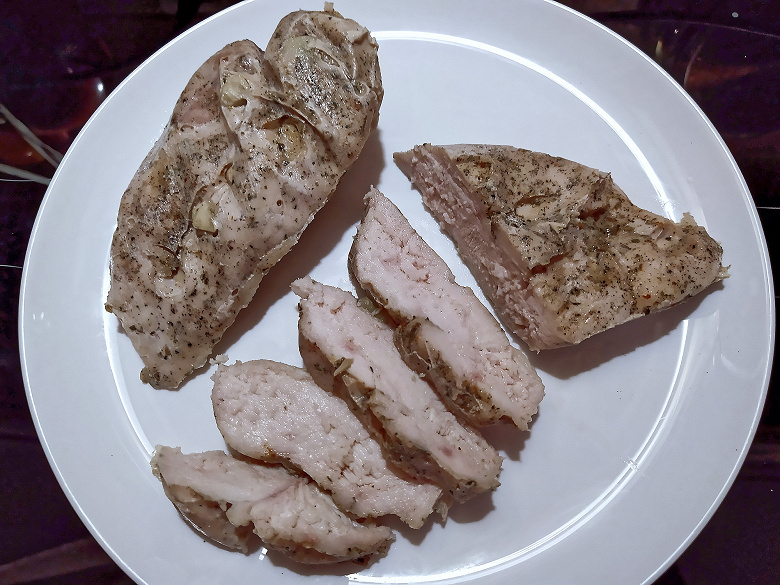 Как видите, влага не успела не то что в насос попасть, а даже приблизиться к шву. Полученный полуфабрикат залили теплой водой и варили полтора часа при температуре 65 °C. В итоге перед нами очень сочное (да, су-вид позволяет даже куриную грудку сделать сочной), пряное мясо.