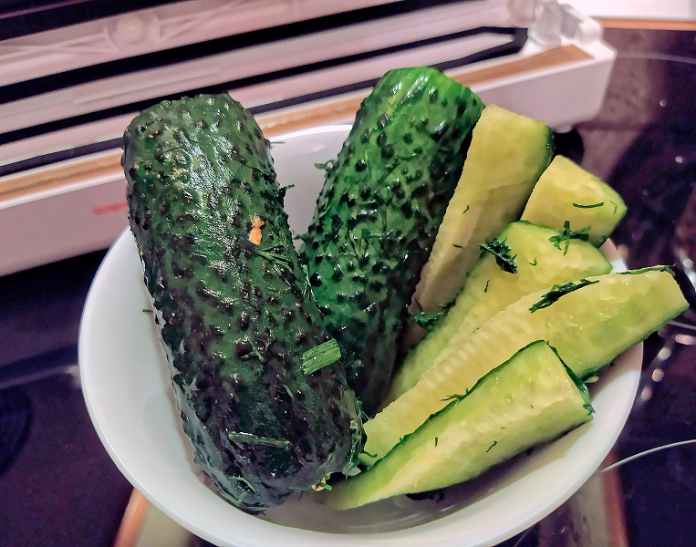Соленья и маринады, приготовленные под вакуумом, сообщает нам инструкция, получаются нежнее и вкуснее, чем приготовленные без вакуума. Что ж, проверим это утверждение, тем более Kitfort любезно сообщает нам рецепт сухой засолки огурцов.