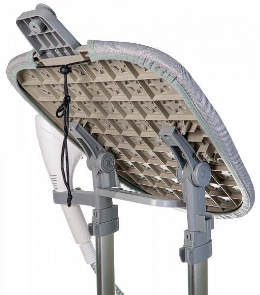 Сверху на доске имеется паз, в который вставляется нижняя часть держателя для вешалки. С любой стороны деталей поворотного механизма доски можно закрепить держатель для утюжка. Это, на наш взгляд, прекрасно — прибором будет удобно пользоваться как правшам, так и левшам.