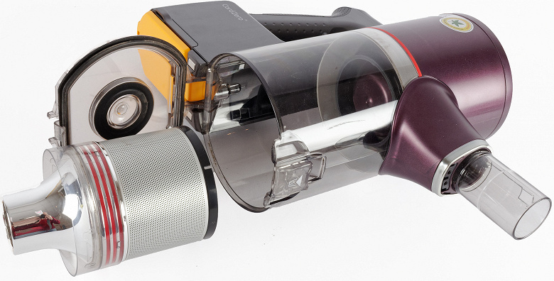Блок циклонного фильтра неразъемный, вынимается он из мусоросборника целиком. Нижняя часть циклона снабжена небольшой «юбкой», задерживающей крупные частицы, а пыль фильтруется металлической сеткой с мелкой перфорацией на боковой стороне цилиндра.