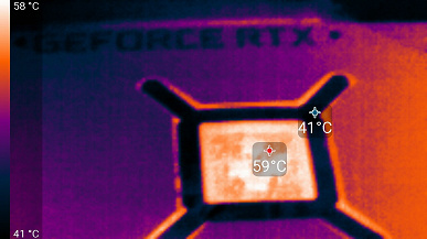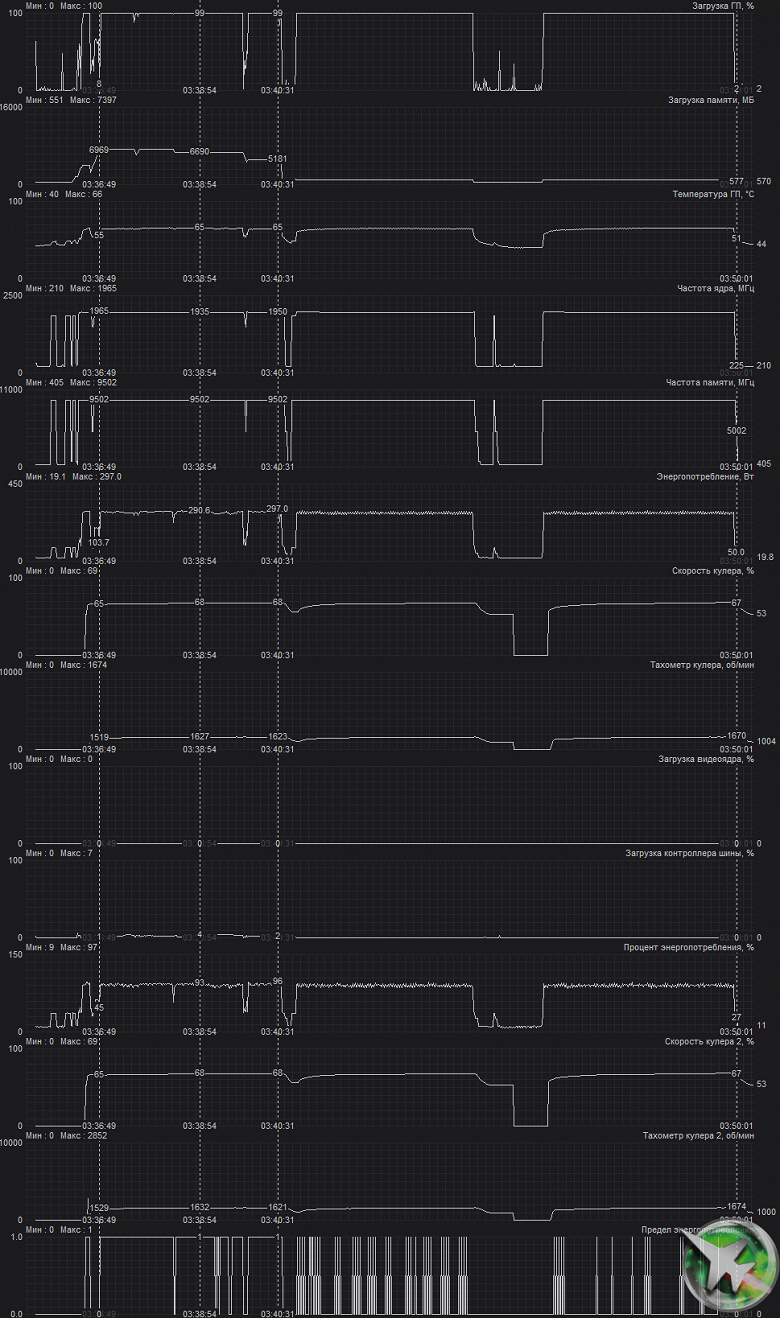 В этом режиме нагрев ядра был немного выше — 72 °C, но вентиляторы вращались медленнее. Память максимально нагревалась до 86 °C, что для GDDR6X вполне приемлемо.