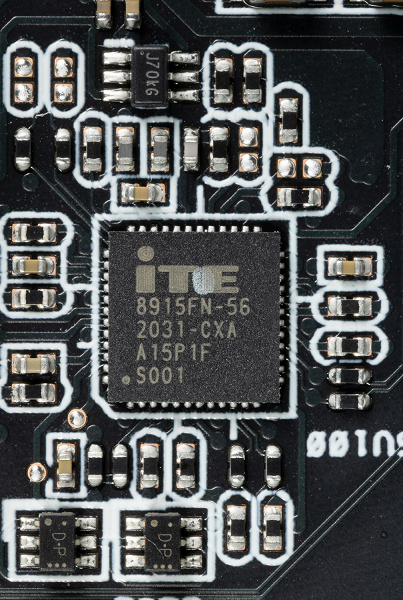 Как и у всей серии видеокарт ROG, у этой платы в хвостовой части имеются два коннектора для подключения корпусных вентиляторов, которые будут работать в соответствии с нагревом видеокарты, за это отвечает контроллер IT8915FN (ITE), он расположен на лицевой стороне PCB.