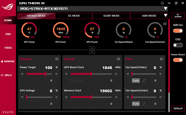 Питание подается через три 8-контактных разъема. Фирменная утилита Asus GPU Tweak в своей новой версии III прекрасно работает с этой картой. Именно через GPU Tweak можно включить фабричный режим OC Mode. Разумеется, есть и возможность ручного разгона.
