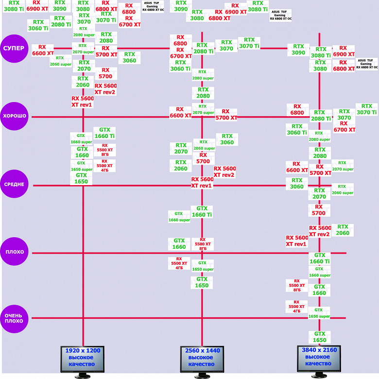 | 15 | RX 6800 XT 16 ГБ, 2015—2422/16000 | 11 | 161 | 150 000 |
