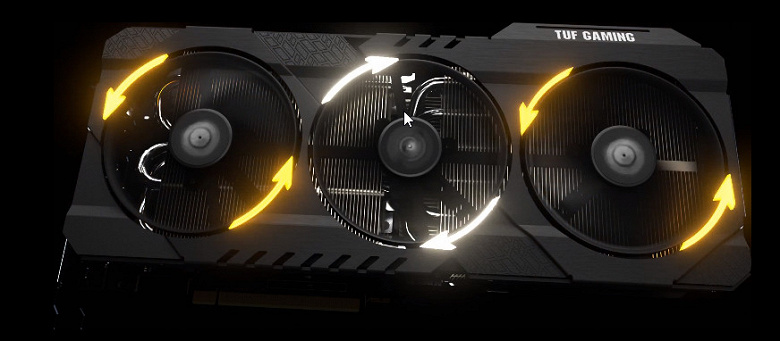 При малой нагрузке на GPU вентиляторы всегда останавливаются. Питание подается через два 8-контактных разъема.