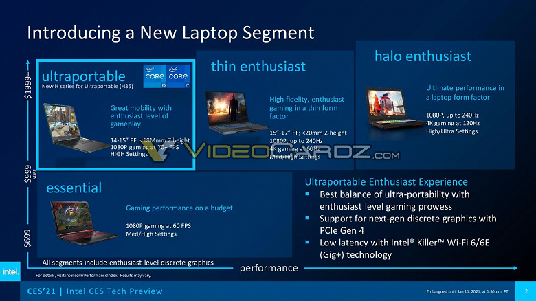 Прежде, чем переходить непосредственно к характеристикам CPU, несколько слов об их общих возможностях. Так, например, Tiger Lake-H35 »обновлены до Intel Killer Wi-Fi 6E (Gig +), чтобы воспользоваться преимуществами самого значительного прогресса Wi-Fi за 20 лет». Так что в ноутбуках на их базе будет очень быстрый Wi-Fi. Вторая особенность Tiger Lake-H35 — встроенный движок ускорения задач ИИ, а третья — Thunderbolt 4.