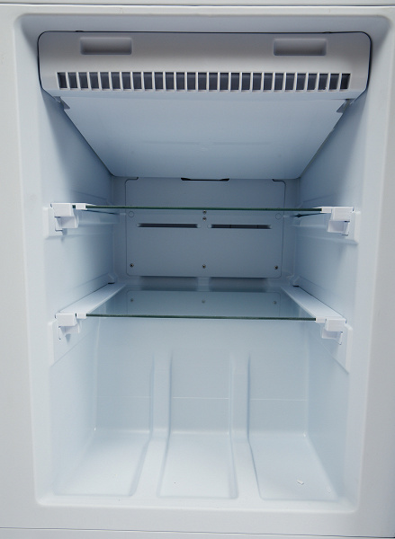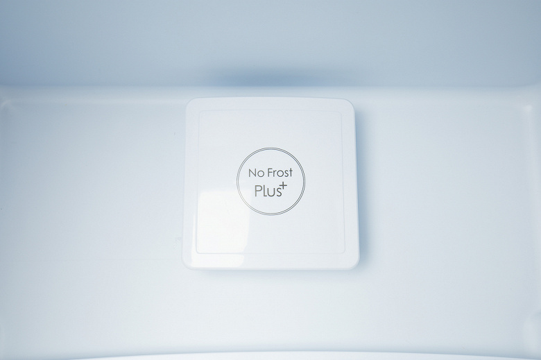 Морозильная камера оборудована системой No Frost, а испаритель на ее потолке закрыт пластиковой панелью, скошенной назад и занимающей заметную долю свободного объема: высота задней стенки верхнего ящика почти на пять сантиметров ниже передней.