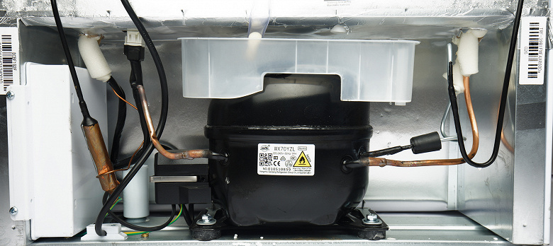 В холодильнике использован компрессор WX70YZL, произведенный Hangzhou Qanjang Refrigeration Group. Он установлен на четырех болтах, которые снабжены резиновыми амортизаторами, снижающими вибрацию. Заправлен холодильный агрегат хладагентом R600a.